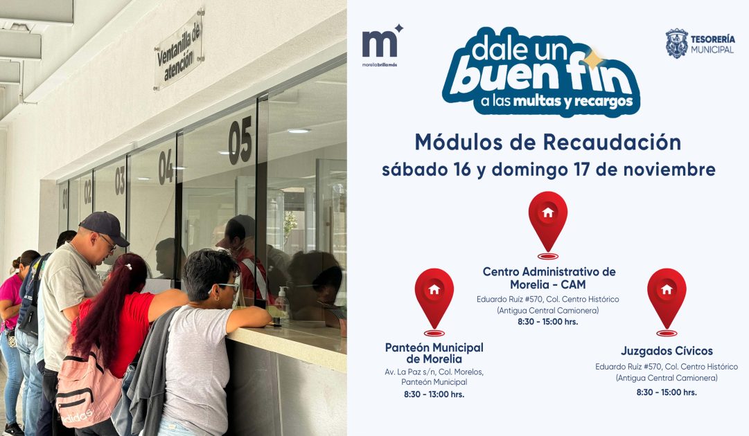 Morelia, Michoacán; 15 de noviembre de 2024.- El Gobierno de Morelia ampliará el servicio de recaudación durante este fin de semana en el Centro Administrativo de Morelia, el Panteón Municipal y los Juzgados Cívicos, en el que las morelianas y morelianos podrán aprovechar los descuentos del Buen Fin que ofrece el Ayuntamiento en multas y recargos generados en servicios municipales.