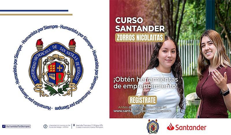 Morelia, Michoacán, a 15 de noviembre de 2024.- El tiempo se agota para inscribirse en los Cursos Santander “Zorros Nicolaitas”, que la Universidad Michoacana de San Nicolás de Hidalgo (UMSNH) pone a disposición de la comunidad universitaria a través de la alianza con Banco Santander, con el fin de ofrecer actividades complementarias para fortalecer las competencias profesionales.