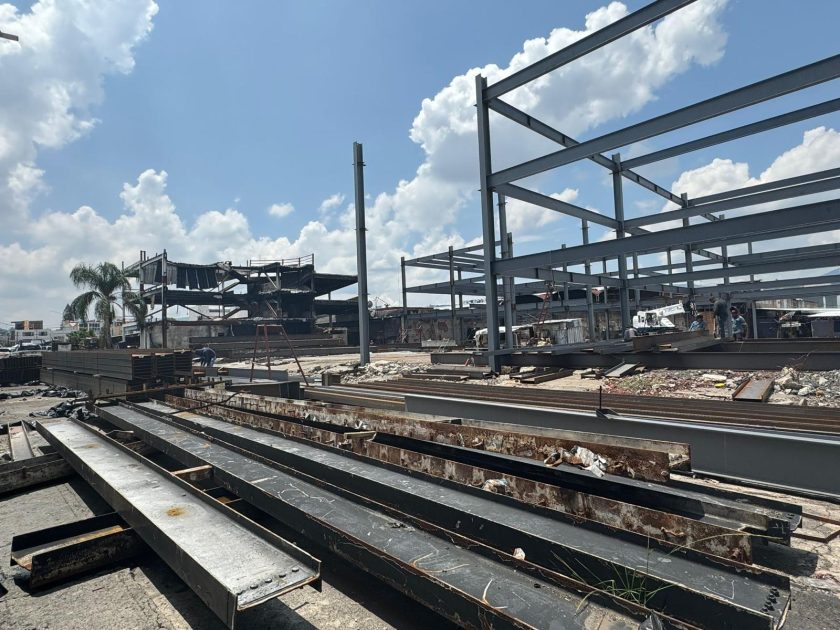 Morelia, Michoacán; 23 de noviembre del 2024.-A un año seis meses del colapso del estacionamiento del Mercado Independencia tras el incendio que se suscitó a su exterior, la construcción del nuevo estacionamiento va lento.
