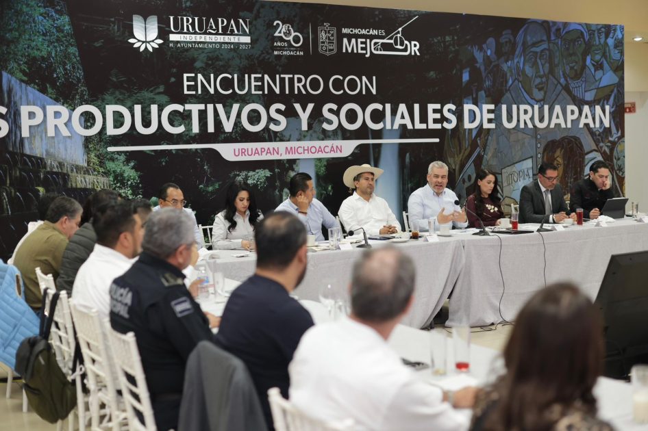 Uruapan, Michoacán, 26 de noviembre de 2024.- El gobernador Alfredo Ramírez Bedolla y representantes de las cámaras de industria, comercio y servicios, así como productores de Uruapan, acordaron reforzar acciones de desarrollo y preservación de la paz en la región.