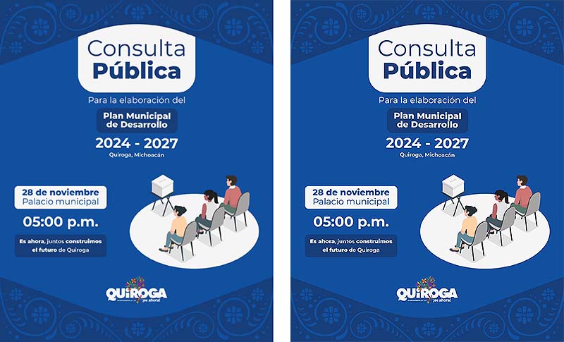 Quiroga, Michoacán, a 26 de noviembre de 2024. – Con el firme propósito de construir un municipio más inclusivo y próspero, el Gobierno de Quiroga extiende una cordial invitación a toda la ciudadanía para participar en el Foro de Consulta Ciudadana para el Plan Municipal de Desarrollo, un espacio diseñado para que la población exprese sus necesidades, propuestas y expectativas.