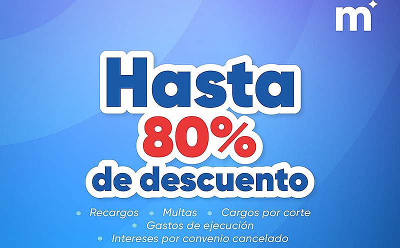 Finalmente reiteró que la promoción consiste en la aplicación de hasta el 80% de descuento en multas, recargos, cargos por corte, gastos de ejecución, entre otros; el pago se podrá realizar en efectivo, con tarjetas de débito o crédito y aprovechar meses sin intereses de las instituciones bancarias participantes.