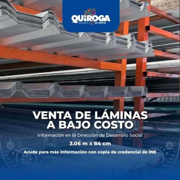 Quiroga, Michoacán, a 06 de febrero 2025. Con la responsabilidad de apoyar a las familias, especialmente aquellas que se encuentran en situaciones vulnerables o de escasos recursos, proporcionando materiales de construcción esenciales a precios accesibles, el Gobierno de Quiroga, a través de la Dirección de Desarrollo Social, pone a disposición láminas galvanizadas de 3.06 m x 84 cm a un costo accesible.
