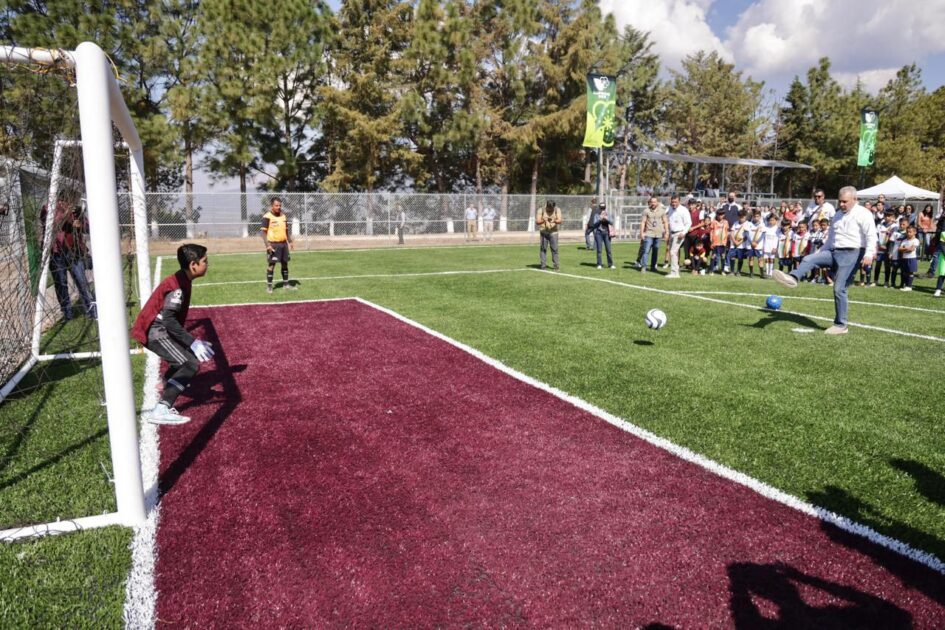 Explicó que el Gobierno estatal construye 41 canchas en 40 municipios, a fin de avanzar en el rescate de espacios públicos para que las niñas, niños y jóvenes puedan llevar a cabo actividades deportivas.