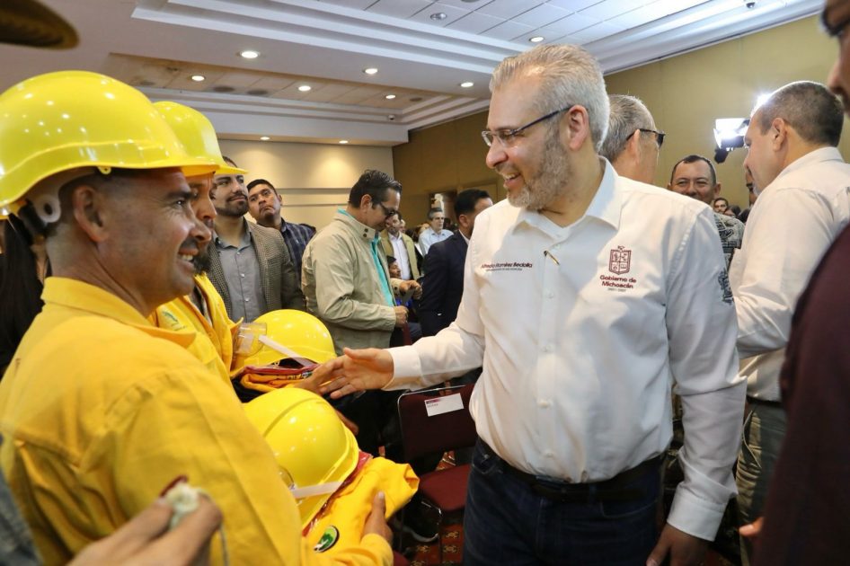 Morelia, Michoacán, 28 de febrero de 2025.- Con la entrega de equipos completos para reforzar las labores de brigadistas contra incendios, el gobernador Alfredo Ramírez Bedolla dio arranque a la campaña de prevención y combate de incendios forestales 2025.