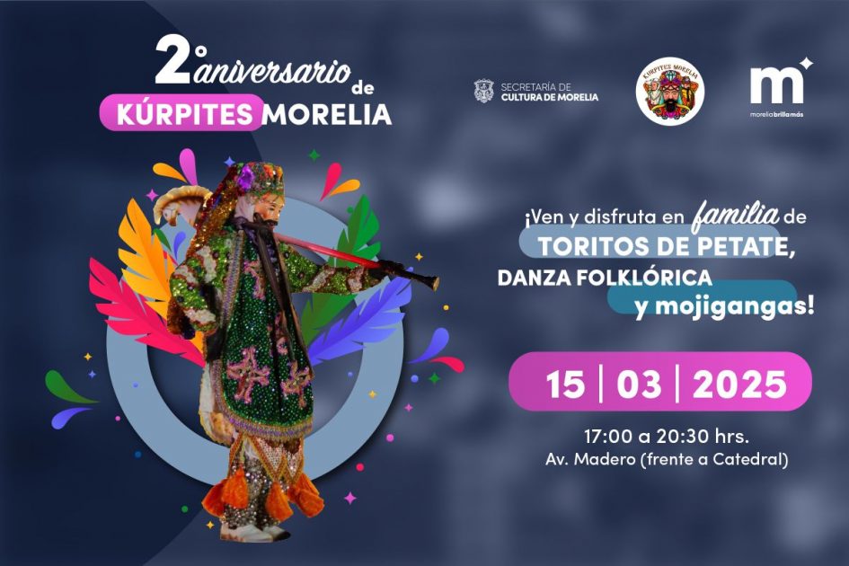 Finalmente, se invita a morelianos, turistas y visitantes a disfrutar del Segundo Aniversario de Kúrpites Morelia, donde se encontrarán con música, danza folklórica, mojigangas y toritos de petate en el centro histórico de la capital michoacana.