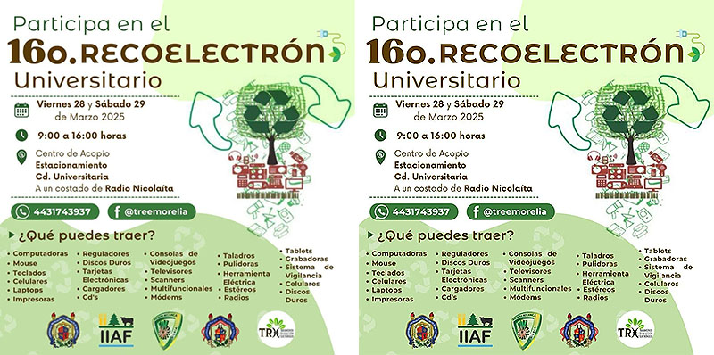 Morelia, Michoacán, a 23 de marzo de 2025.- La Universidad Michoacana de San Nicolás de Hidalgo (UMSNH) invita a la población en general a participar en el 16° Recoelectrón Universitario, que se llevará a cabo el próximo 28 y 29 de marzo.