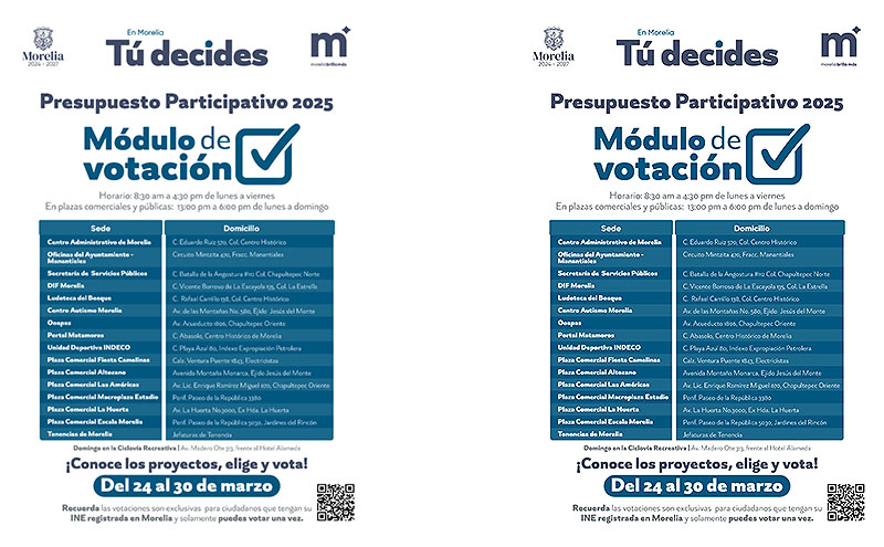 La votación estará abierta hasta el 30 de marzo, y podrá realizarse de forma digital en https://presupuestoparticipativo.morelia.gob.mx/votaciones/, o de forma presencial, en los módulos instalados en diferentes puntos de Morelia y tenencias del municipio.