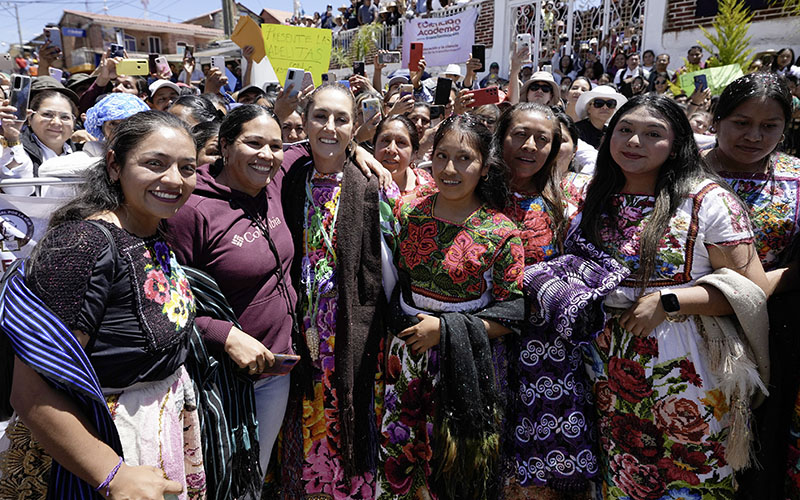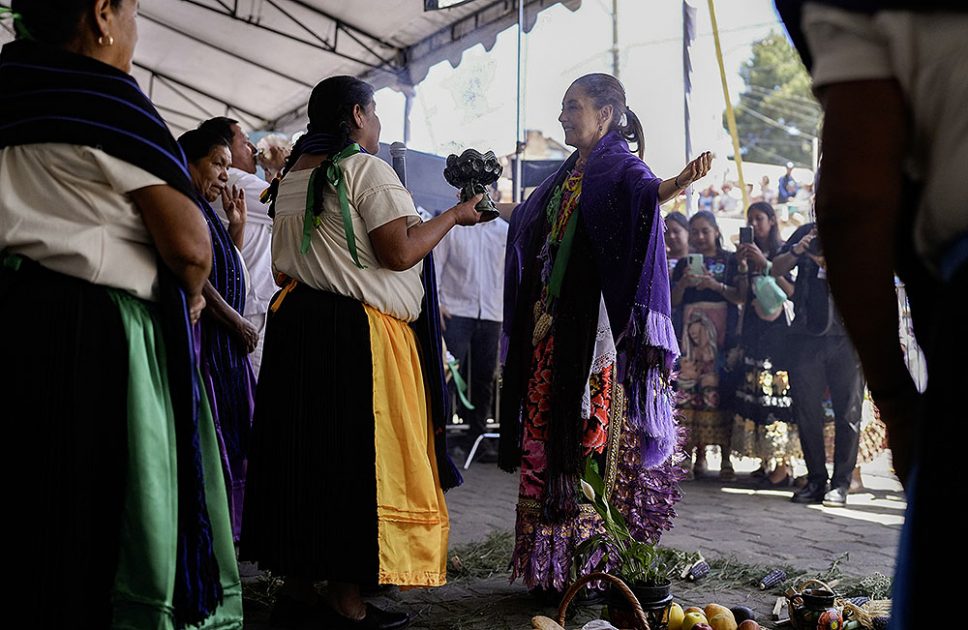 A la comunidad indígena de Cheranástico, perteneciente al municipio de Paracho, Michoacán, ubicada en la zona alta de la Meseta Purépecha, llegó la mandataria nacional. Vestida de pantalón y blusa bordada, con zapato bajito, del cómodo. Pero en el trayecto las mujeres le pusieron rebozos: Blanco, morado y negro, así como diversos colguijes de maíz y un mandil.