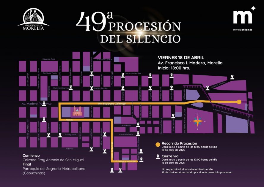 RECORRIDO: Inicia a las 18:00 horas, en la Calzada Fray Antonio de San Miguel, para continuar sobre la Avenida Francisco I. Madero hasta llegar a Abasolo, siguiendo por Allende, Vasco de Quiroga, y Ortega y Montañez, hasta concluir en la Parroquia del Sagrario Metropolitano (Templo de Capuchinas).