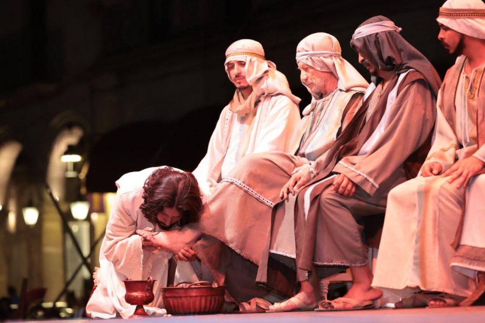 Decenas de actores perfectamente vestidos con indumentaria de la época, rememoraron el Consejo Sanedrín, el lavatorio de pies y la Última Cena, todo ello, acompañados de pantallas gigantes y sonido.