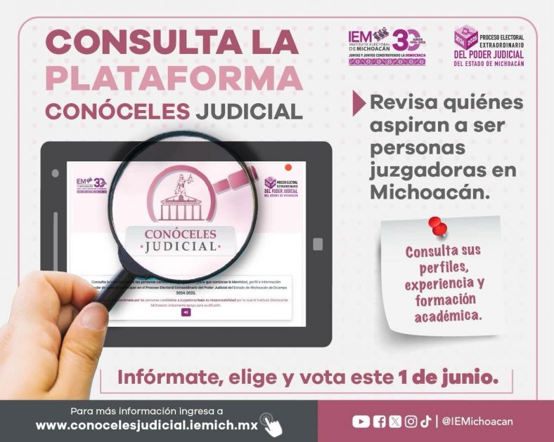 Morelia, Michoacán, 21de abril de 2025.-Con el objetivo de garantizar el derecho de la ciudadanía a emitir un voto informado, el Instituto Electoral de Michoacán (IEM) habilitó el sistema “Conóceles Judicial”, una plataforma digital donde se puede consultar la trayectoria profesional y académica de las personas candidatas a integrar el Poder Judicial del Estado.