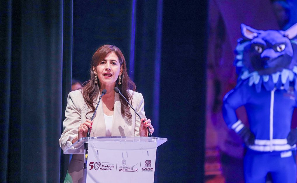 Morelia, Michoacán, 29 de mayo de 2025.- La Nueva Escuela Mexicana (NEM) centrada en formar estudiantes con una visión integral, se fortalece con actividades como la 41 Jornada Académica, Cívica, Cultural y Deportiva del Colegio de Bachilleres del Estado de Michoacán (Cobaem), destacó la secretaria Gaby Molina al participar en la inauguración del evento.