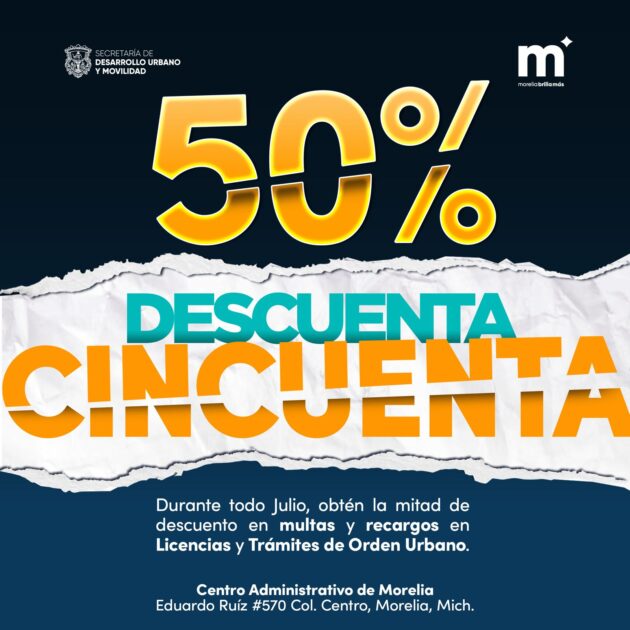 Morelia, Michoacán a 1° de julio de 2025.- Con el objetivo de apoyar a la ciudadanía y facilitar la regularización de trámites, el Gobierno de Morelia bajo las instrucciones del presidente Alfonso Martínez Alcázar, lanza “¡Descuenta 50%!”, una campaña especial de condonación de recargos y multas, que estará vigente del 1° al 31 de julio de 2025, dirigida a personas que tengan adeudos en tres rubros importantes: trámites urbanos, construcción o vivienda, y licencias de funcionamiento.