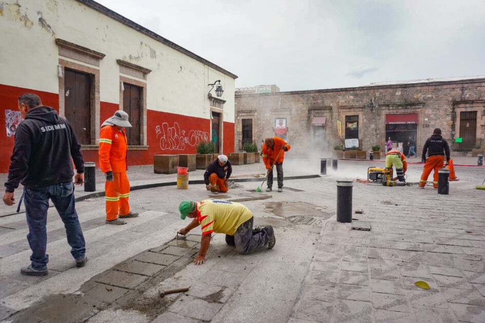 Morelia, Michoacán.- Continúan los trabajos de rehabilitación en varias calles aledañas a la iglesia de San José, en el Centro Histórico de Morelia. algunas vialidades siguen cerradas al tránsito vehicular debido al avance gradual de las obras.