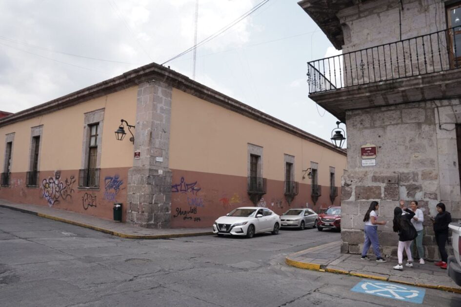 Morelia, Michoacán.–En la esquina de Santiago Tapia con Benito Juárez, un inmueble del Centro Histórico continúa acumulando grafitis en toda su fachada. Esto en el marco que turistas continúan llegando a la capital por temporada vacacional.