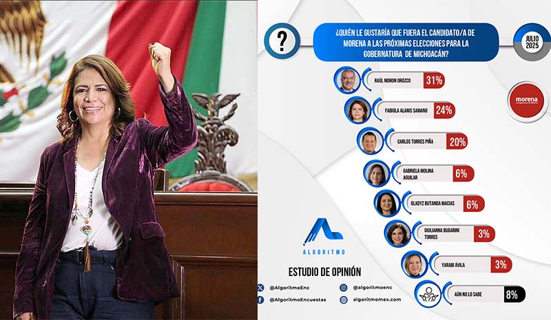 Morelia, Michoacán.-Con 24 por ciento de las preferencias para encabezar la candidatura al gobierno del estado en 2027, Fabiola Alanís Sámano se consolida como la mujer de Morena con mayores posibilidades para contender en las próximas elecciones estatales, conforme a los resultados de la encuesta publicada por la firma Algoritmo, correspondiente a julio de este año.