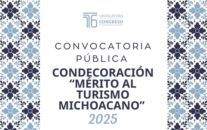 Morelia, Michoacán, 12 de agosto de 2025.- El Congreso del Estrado abrió la convocatoria para la entrega de la Condecoración “Mérito al Turismo Michoacano”, en su edición 2025, en la que instituciones públicas y privadas, podrán presentar propuestas de prestadores de servicios turísticos, que hayan destacado por su interés, creatividad, inversión, atención y promoción de la actividad turística en Michoacán.
