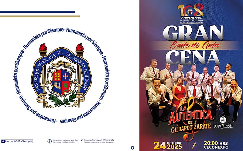 Morelia, Michoacán, a 17 de agosto de 2025.- ¡Celebra el 108 aniversario de la Universidad Michoacana de San Nicolás de Hidalgo!, asiste a la Gran Cena Baile de Gala, que se realizará el próximo 24 de octubre.