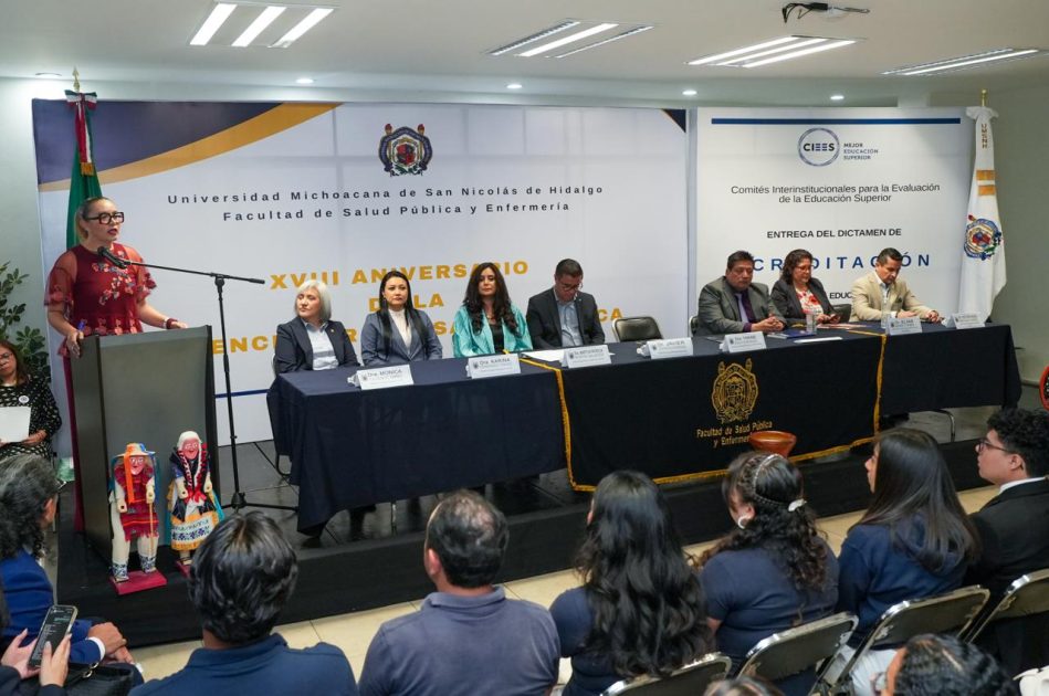 Morelia, Michoacán, a 05 de octubre de 2025.- La Licenciatura en Salud Pública de la Universidad Michoacana de San Nicolás de Hidalgo (UMSNH) obtuvo la primera acreditación en su historia por parte de los Comités Interinstitucionales para la Evaluación de la Educación Superior (CIEES), la cual fue recibida por la rectora Yarabí Ávila González, en el marco del XVIII Aniversario de la Facultad de Salud Pública y Enfermería.