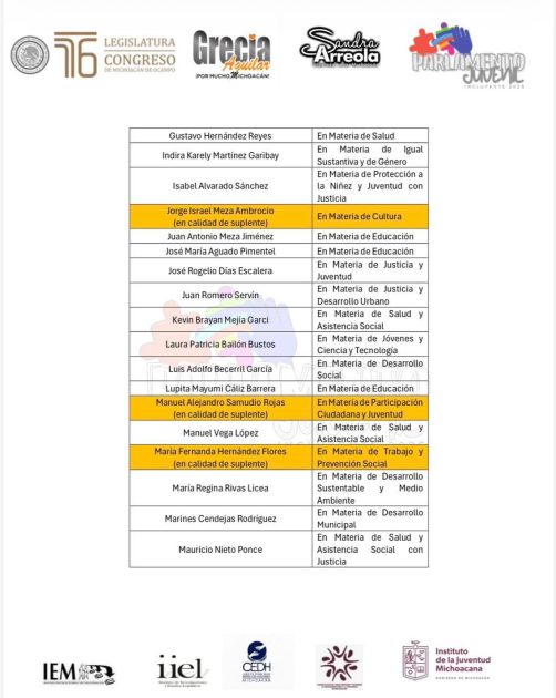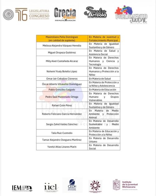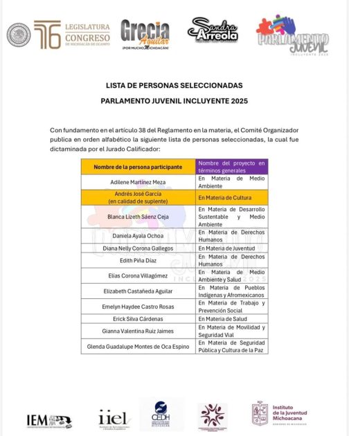 Morelia, Michoacán, a 18 de octubre de 2025.- Tras reconocer la participación de las y los jóvenes, la diputada Grecia Jennifer Aguilar Mercado, presidenta del Comité Organizador del Parlamento Juvenil Incluyente 2025, dio a conocer la lista de las y los seleccionados que formarán parte de este importante ejercicio de participación democrática, incluyente y transformadora.