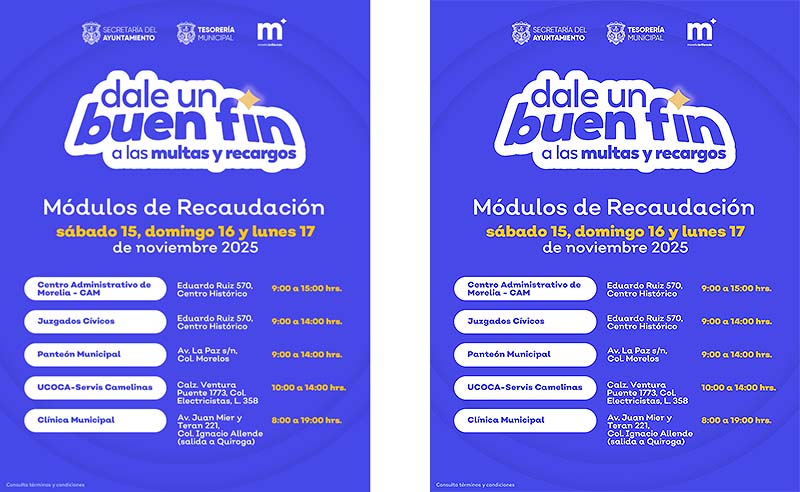 Morelia, Michoacán; 16 de noviembre de 2025.- Con el objetivo de apoyar la economía de las familias y empresas morelianas, el gobierno del presidente municipal, Alfonso Martínez Alcázar, invita a la ciudadanía a aprovechar el puente oficial del 15 al 17 de noviembre para ponerse al día en sus contribuciones, con los descuentos que ofrece en su programa “Dale un buen fin a las multas y recargos”.
