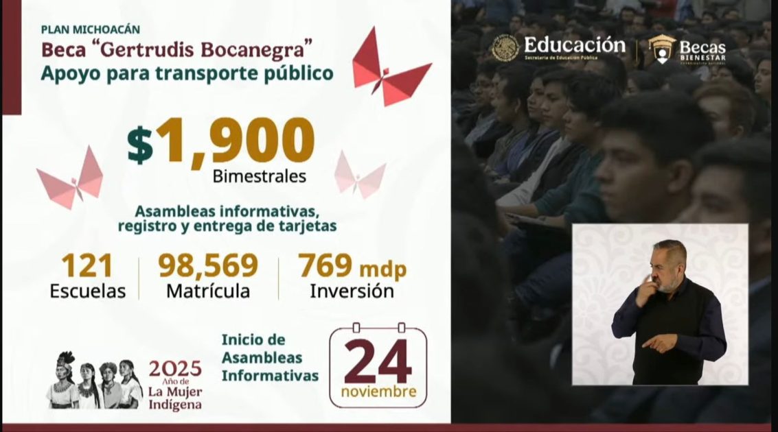 Morelia, Michoacán, 17 de noviembre de 2025.- Más de 98 mil 500 jóvenes universitarios en el estado serán beneficiados con la Beca Gertrudis Bocanegra, un apoyo económico de mil 900 pesos bimestrales para que no abandonen sus estudios por falta de recursos, informó el gobernador Alfredo Ramírez Bedolla.