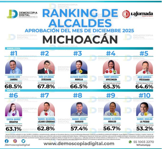 Morelia, Michoacán, a 10 de enero de 2026.- El presidente municipal de Pátzcuaro, Julio Arreola, registró 64.6% de aprobación en la evaluación de diciembre de 2025, de acuerdo con el ranking estatal difundido por Demoscopia Digital en colaboración con La Jornada.