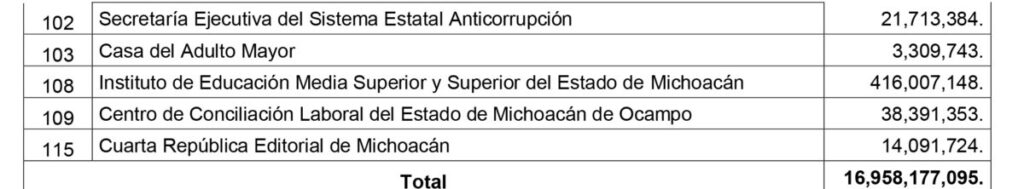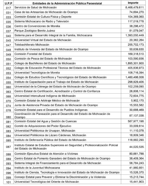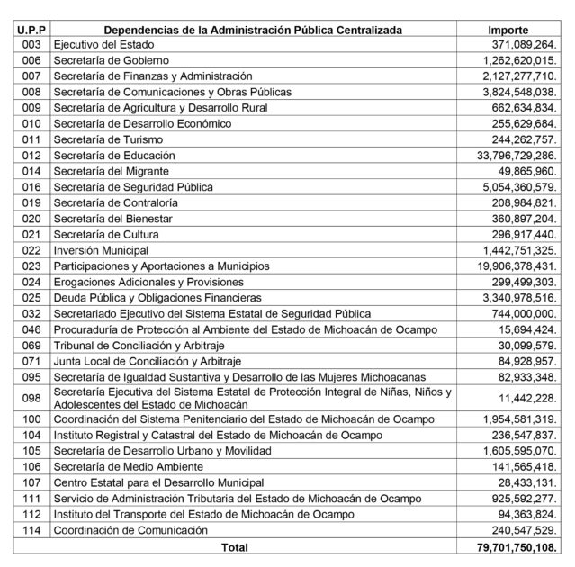 El pleno de diputados michoacanos aprobó que se le asignara a las dependencias de la administración pública centralizada la cantidad total de $79 mil 701 millones 750 mil 108 pesos