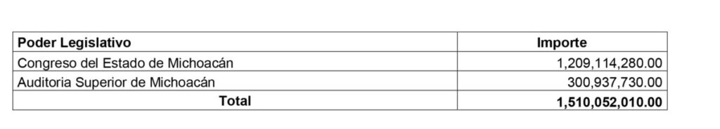 Morelia, Michoacán.-El Poder Legislativo de Michoacán recibirá para el ejercicio fiscal 2026 un total de 1,510 millones 052 mil 10 pesos.