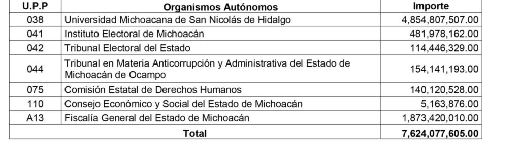 Morelia, Michoacán.-Para los siete organismos autónomos de Michoacán, el pleno de la 76 Legislatura aprobó destinar para el ejercicio fiscal 2026, un total de 7 mil 624 millones,077 mil 605 pesos.