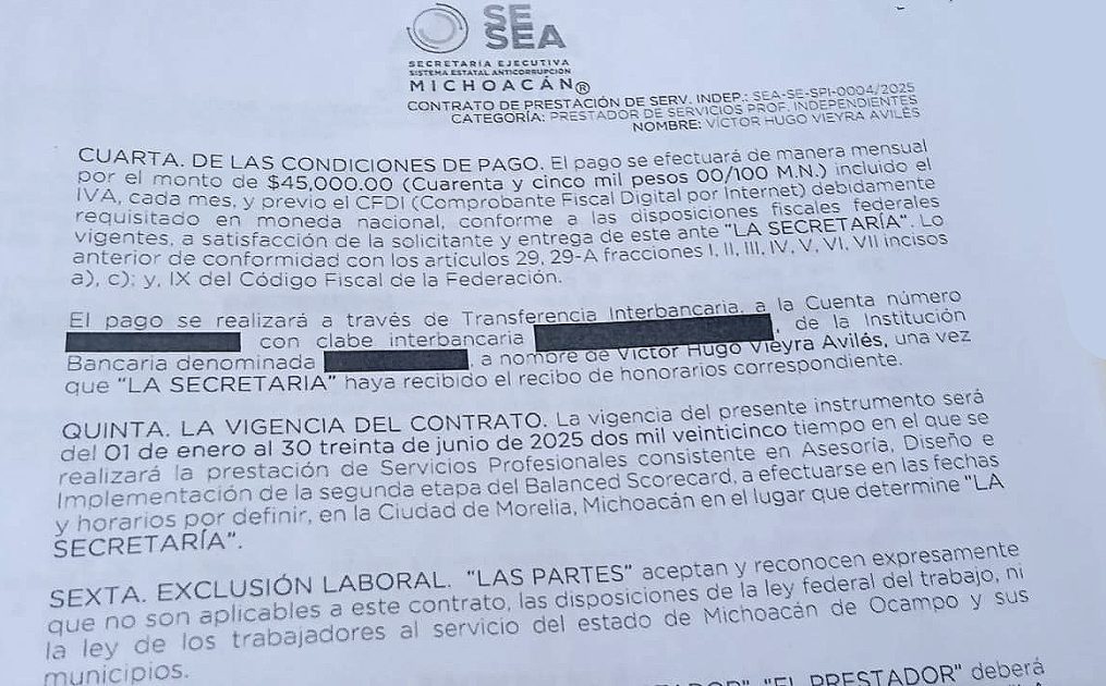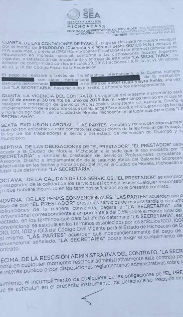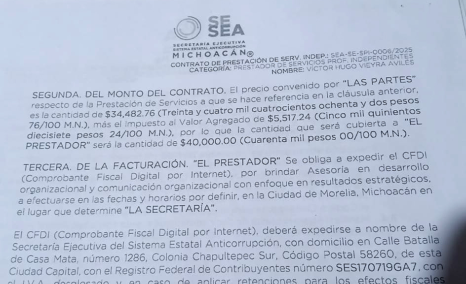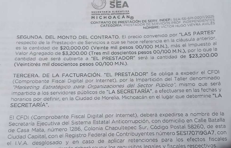 Además, el 3 de febrero de 2025, se celebró otro contrato entre las mismas partes, en el cual Vieyra Avilés se comprometió a brindar asesorías en desarrollo y comunicación organizacional con enfoque en resultados estratégicos, en fechas y horarios por definir, en la ciudad de Morelia. El monto acordado fue de 34 mil 482.76 pesos, más 5 mil 517.24 pesos de impuesto al valor agregado, sumando un total de 40 mil pesos, cantidad que sería transferida directamente a la cuenta bancaria del prestador.