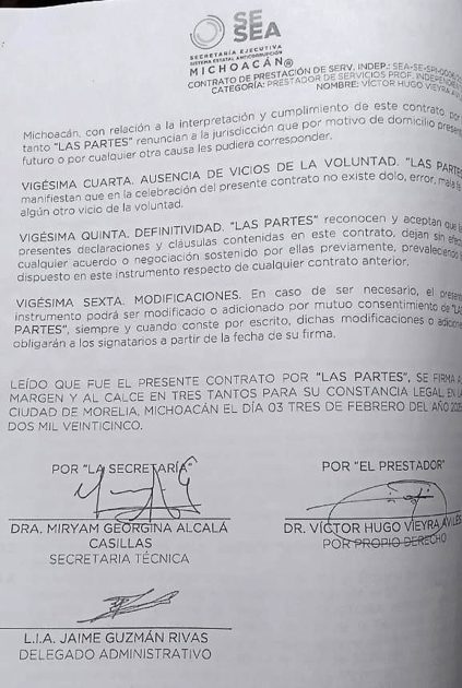 Uno de los documentos revisados corresponde al contrato de prestación de servicios profesionales independientes SEA-SE-S.P.I-0004/2025, celebrado el 8 de enero de 2025, mediante el cual la Secretaría Ejecutiva contrató a Vieyra Avilés para brindar “otras asesorías para la operación de programas”. En dicho documento, el beneficiario se presenta con el grado de doctor en Ciencias en Negocios Internacionales por la Universidad Michoacana de San Nicolás de Hidalgo.