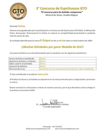 Las dos bebidas galardonadas fueron: una de whisky’s de producción artesanal, “El Origen”, de donde de 100 obtuvo un 89.95%, llevándose la presea de oro, así como también su whiskey “La Noche Triste”, donde obtuvo 80.1% de 100 llevándose medalla de plata.