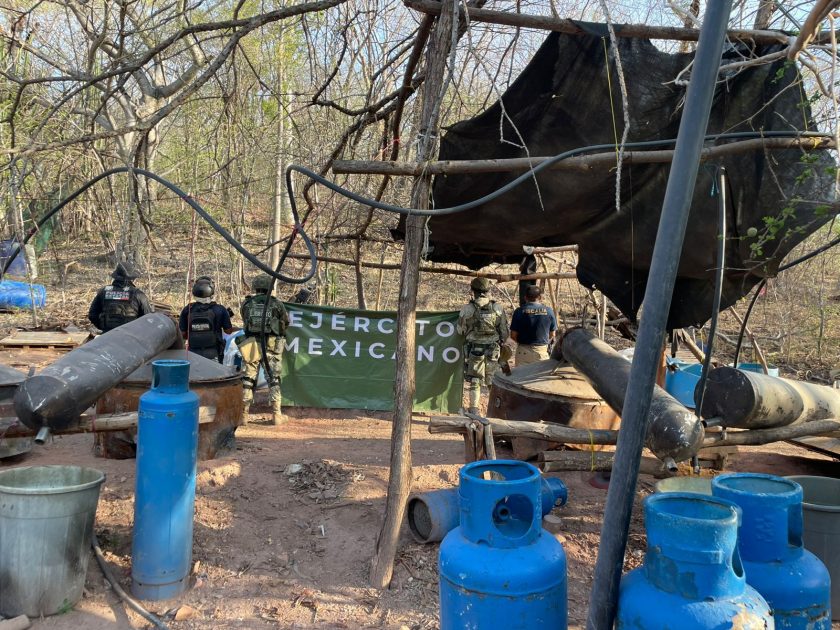 El predio fue detectado sobre un camino de terracería de la localidad de Baztán del Cobre, donde aseguraron 155 tambos con sustancias químicas . Además, 50 bidones de 50 litros, también con sustancias utilizadas para la elaboración de drogas sintéticas. De igual forma, se encontraron 24 cilindros de gas, 17 ollas de peltre tipo vaporera, 120 bultos de sosa cáustica y 80 tambos.